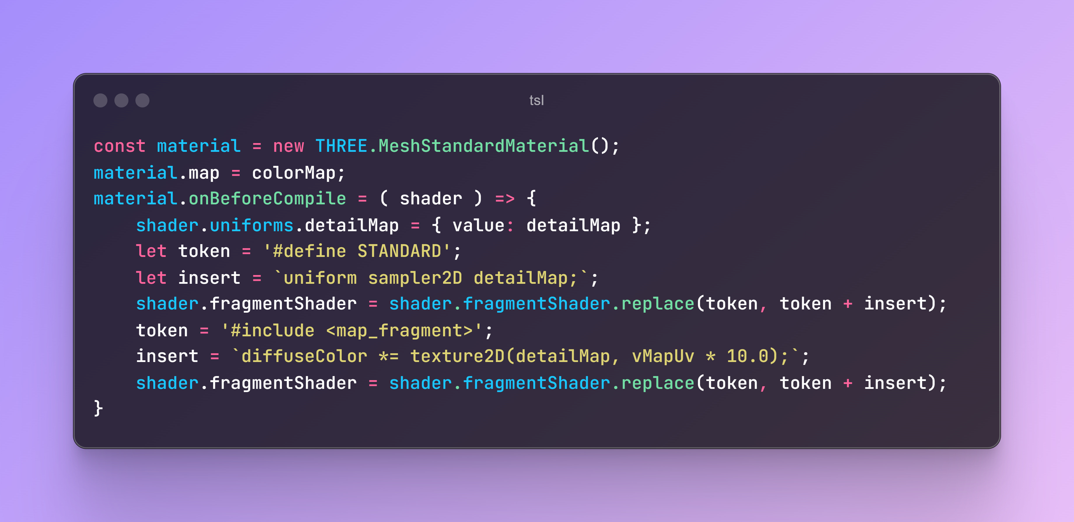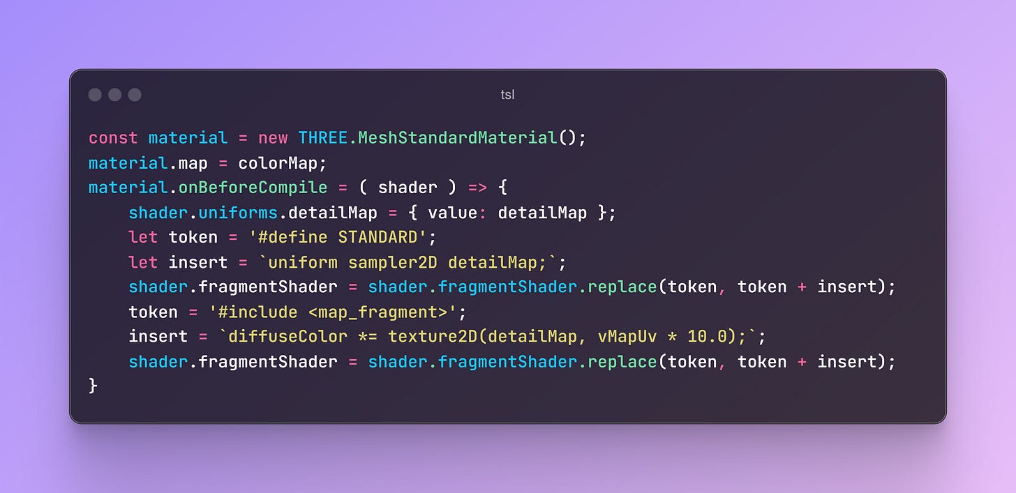 The best way to see the advantage of TSL is through practical examples. Let’s say you want to add details to an object’s surface, like small cracks or reliefs, to make it more realistic. Here’s how you’d do it in GLSL and then in TSL.